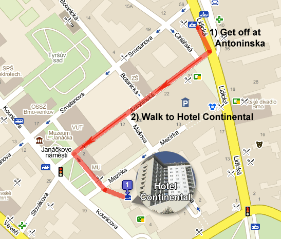 ParkingThe underground parking of FIT BUT is available to Odyssey participants for free. The parking is located under the steel and glass building ‘Bozetechova 1’, and can be entered from the bottom of ‘Metodejova’ street. Ring the bell ‘VRATNICE’, say that you go to Odyssey conference and the guard will open the gate. The way from the parking to the conference venue will be marked, in case you can’t find the way, just exit the parking on foot (press the white button in case the gate is closed) and cross ‘Bozetechova’ street. To get back to the parking, ask the guard or any local participant of Odyssey. To exit the parking, simply press the white button at the exit. Remember, that ‘Metodejova’ is a one-way street, turn to the left when leaving the parking. Hotel ContinentalIf you stay at the Hotel Continental, here you can find some useful information.